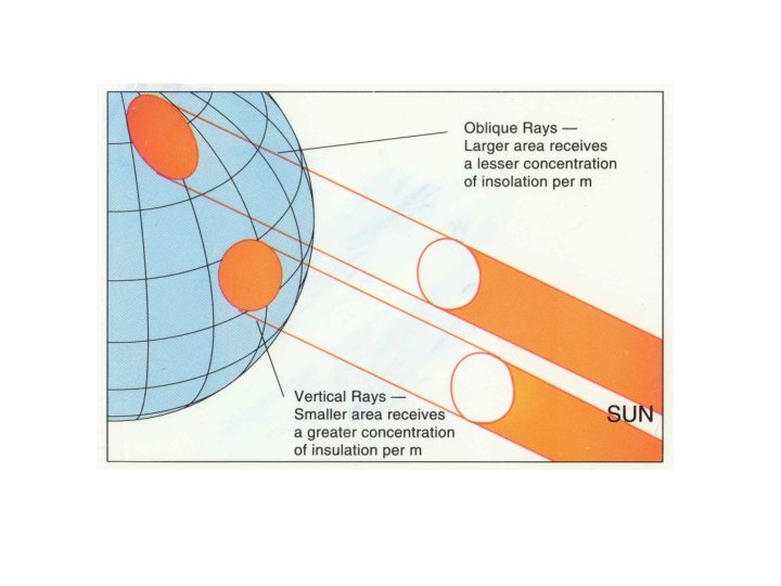 Factors 1. Angle of insolation - direct or indirect 2. Length of Day - how much sunshine is available. 3. Type of Surface: -- light or dark -- rough or smooth
