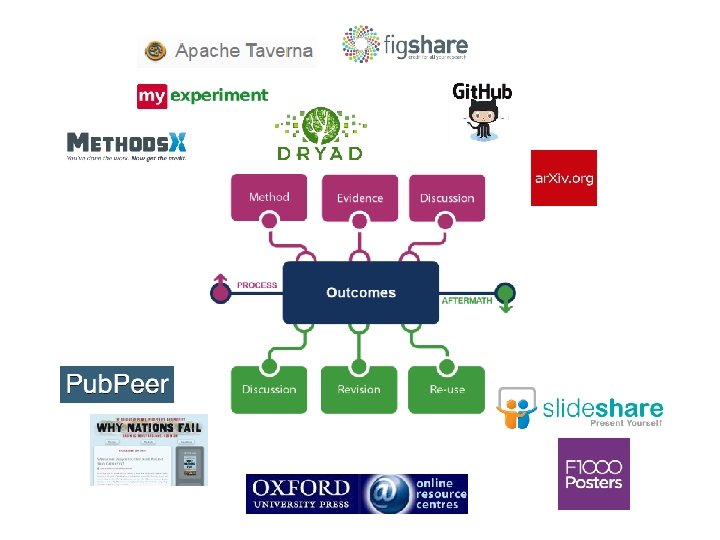 ar. Xiv, SSRN, Re. PEc, Pub. Med Central ( disciplinary repositories that have become important discovery hubs); Google Scholar, Google Books, Amazon (ubiquitous discovery and fulfillment hubs); Mendeley, Research. Gate (services for social discovery and scholarly reputation management); Goodreads, Library. Thing ( social description/reading sites); Wikipedia, Yahoo Answers, Khan Academy (hubs for open research, reference, and teaching materials). Fig. Share, Open. Refine ( data storage and manipulation tools) Github ( software management)