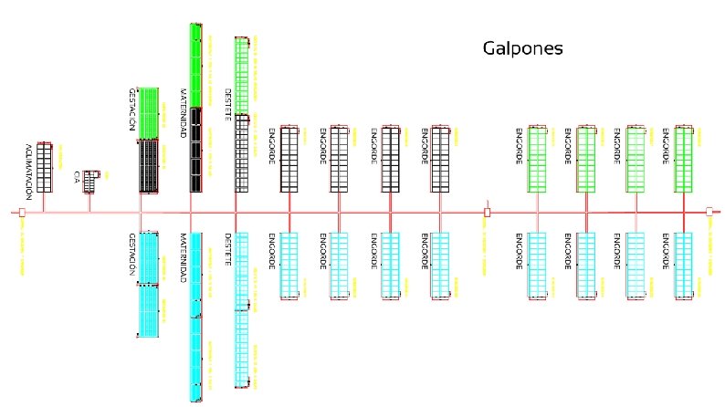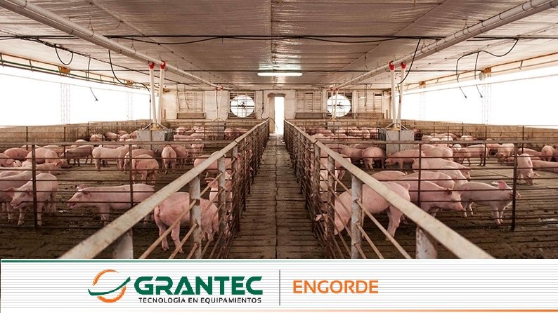 Edad de Ingreso: 70 días de vida Peso de Ingreso : 25 -30 kg Edad de Egreso: 168 -170 días apróximadamente Peso de Egreso: 110 kg apróximadamente depende del mercado Estadía: 98 días Galpón: abierto o cerrado Ventilación: natural con cortinas y ventiladores de movimiento de aire o forzada con cortinas y ventilación tipo túnel Densidad: 1 animal cada 0, 75 -0, 85 mts 2 Pisos: full slat Agua de bebida: 1 chupete cada 10 animales Alimentación: 2 silos c/ línea de distribución Comedero: 1 boca cada 16 animales seco-húmedo Refrigeración: sistema de riego tipo fogger en la natural y paneles evaporativos en la forzada