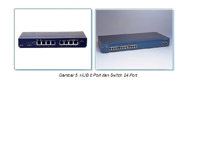 3. Modem atau Modul the Modulator adalah peralatan jaringan yang digunakan untuk terhubung ke jaringan internet menggunakan kabel telepon. 4. HUB/Switch HUB atau Switch digunakan untuk menghubungkan setiap node dalam jaringan LAN. Peralatan ini sering digunakan pada topologi star dan extended star. Perbedaan antara HUB dan Switch adalah kecepatan transfer datanya. Yaitu 10: 100 Mbps.