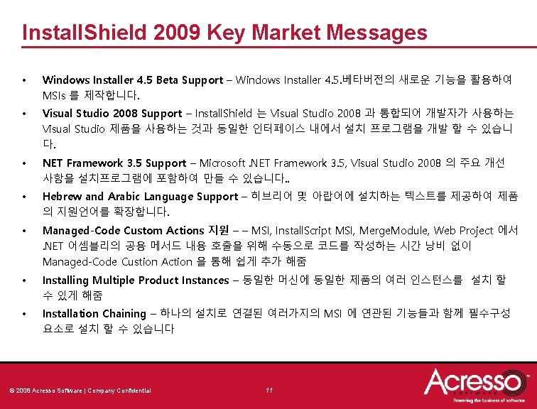 Editions • Premier Edition This has benefits for: – The Customer : extra value, more functionality – You : extra revenue! • Trialware - Try and Die 기능 몇가지의 간단한 설정 변경으로 Trial Version 의 기능 작성 제공 • Multilingual Support - 설치 다이얼로그와 메시지 박스의 번역을 위한 수백 시간의 노력을 줄여줌 • Stand Alone Build • Repackager • Best Practice Validation Suite © 2008 Acresso Software | Company Confidential 10