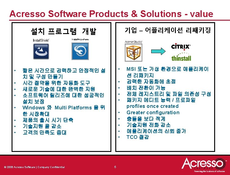 Introduction - Acresso Software Ltd • 새로운 회사의 설립 2008년 4월 1일 • Private Equity Investment • 이전에는 Macrovision 모든 소프트웨어 제품 및 브랜드 : – Install. Shield, Admin. Studio, Workflow Manager, Install. Anywhere, Flex. Net Publisher, Flex. Net Manager, Flex. Net connect & virtualisation support • 소프트웨어 라이선스와 리패키징 및 설치 프로그램에 대한 시장의 선 두 주자 • WW HQ in Santa Clara • APAC HQ in Tokyo © 2008 Acresso Software | Company Confidential 2