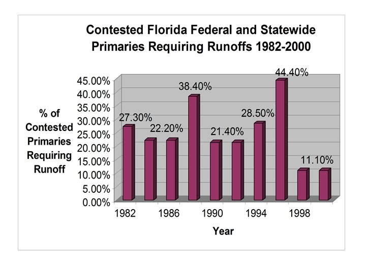 Runoffs in Florida: A Few Facts • Winners in multi-candidate state primaries are very likely to win the general election • Multi-candidate primaries are not unusual • With runoffs, frontrunning candidates after the first primary will sometimes lose • Voter turnout almost always drops significantly in down-ballot races that go to runoffs