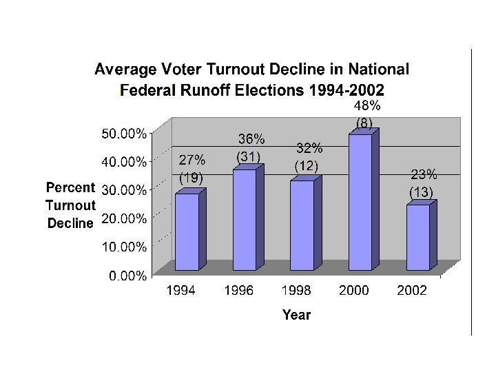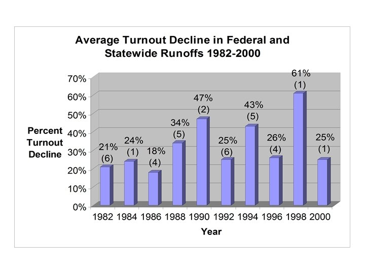 Number of Races that went to a Runoff: 1998 – 9 2000 – 22 2002 – 23* * In 2002, indicates number of plurality winners in primary
