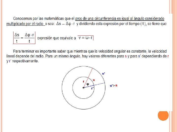 ¿Qué tipo de descripción movimiento circular? puede hacerse de un Si nos fijamos bien, cuando un objeto se mueve en forma circular, por un lado está moviéndose a lo largo de un arco de la circunferencia y por otro lado está recorriendo ángulos. Si el movimiento se describe respecto al arco descrito por el objeto, se habla de velocidad lineal o tangencial (v). Si el movimiento se describe respecto al ángulo descrito por el radio de la circunferencia descrita, que une el centro del objeto con el centro de la circunferencia, se habla de velocidad angular (ω)
