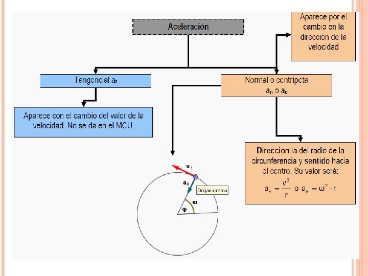 Cada vez que hay un cambio de velocidad, ya sea que cambie su valor numérico (magnitud) o su dirección, hay una aceleración. En este caso la aceleración que hay se denomina aceleración centrípeta. Y la aceleración centrípeta (ac) se dirige hacia el centro de la circunferencia que forma la trayectoria del objeto que se mueve.