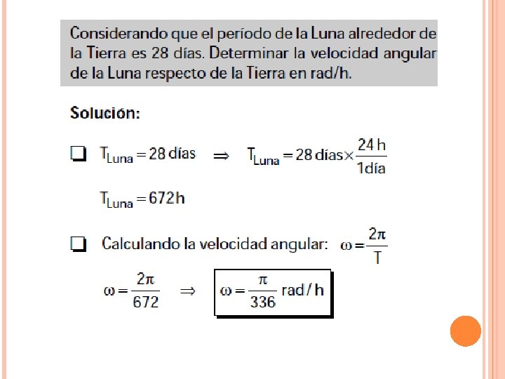 La velocidad angular también se puede determinar si sabemos el tiempo que tarda en dar una vuelta completa: = 2 π/T Sabemos que T = 1/F entonces: = 2π F en rad/seg.