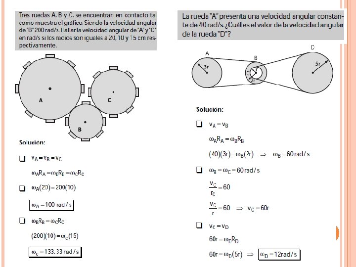 VELOCIDAD ANGULAR A la razón del cambio del desplazamiento angular al tiempo transcurrido se le denomina velocidad angular, y esta dada por, = t = velocidad angular en rad/seg. = desplazamiento angular en rad. t = tiempo en segundos en que se efectuó el desplazamiento angular. El símbolo (omega) se usa para denotar la velocidad angular. Aunque se puede expresar en revoluciones por minuto (rev/ min, rpm. ) o revoluciones por segundo (rev/s) en la mayor parte de los problemas físicos se hace necesario usar radianes por segundo (rad/s) para adaptarse a fórmulas más convenientes.