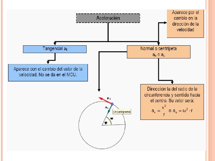 ACELERACIÓN CENTRÍPETA En el movimiento circular uniforme, la magnitud de la velocidad de la partícula permanece constante, y por tanto la partícula no posee aceleración lineal. Pero la dirección del vector velocidad varía continuamente, la partícula posee aceleración centrípeta. El valor de la aceleración centrípeta está dado por: