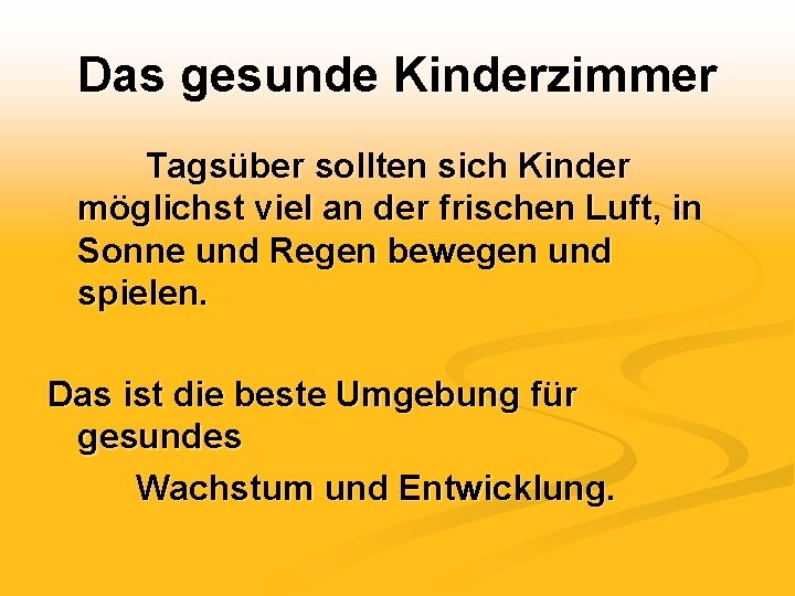 Das gesunde Kinderzimmer Tagsüber sollten sich Kinder möglichst viel an der frischen Luft, in Sonne und Regen bewegen und spielen. Das ist die beste Umgebung für gesundes Wachstum und Entwicklung.