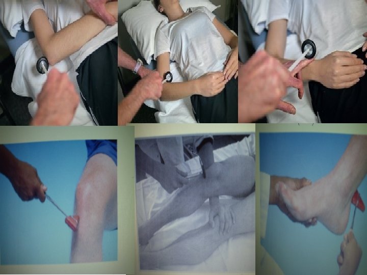 2/ R proprioceptifs: Manœuvre d’Hoffmann: examinateur tient entre son pouce et l’ index , la 1° phalange de l’index et majeur du patient auquel il imprime une brusque flexion→ flexion des doigts et flexionabduction du pouce. Manœuvre de Rossolimo: percussion la face plantaire au niveau de la région métatarso-phalagienne →flexion plantaire des orteils. Réflexe pendulaire : pour R rotulien et tricipital → réponse réflexe est une série d’oscillations pendulaires de la jambe ou avant-bras, cette perturbation est particulière ∑d cérébelleux.