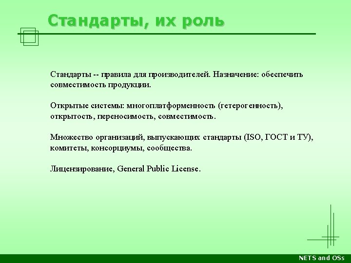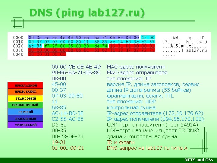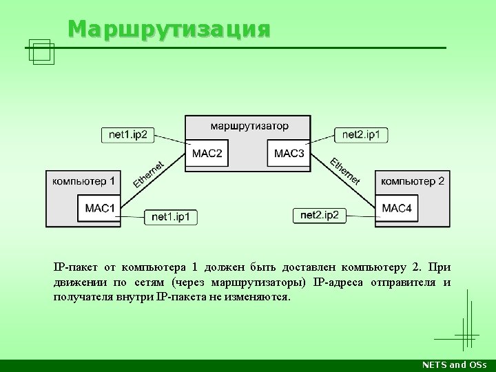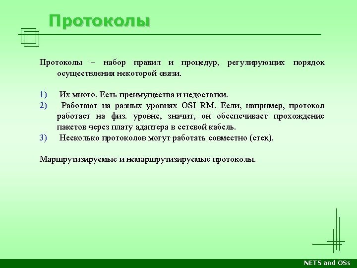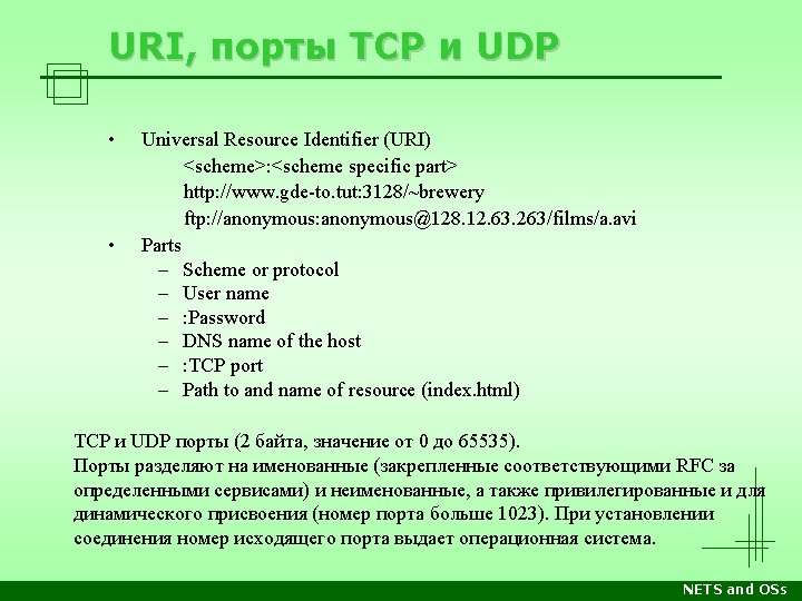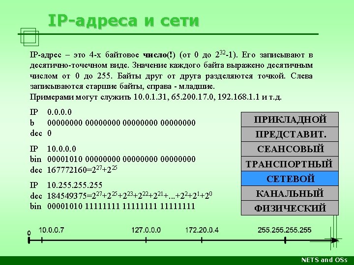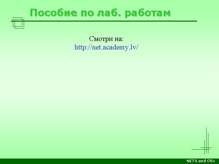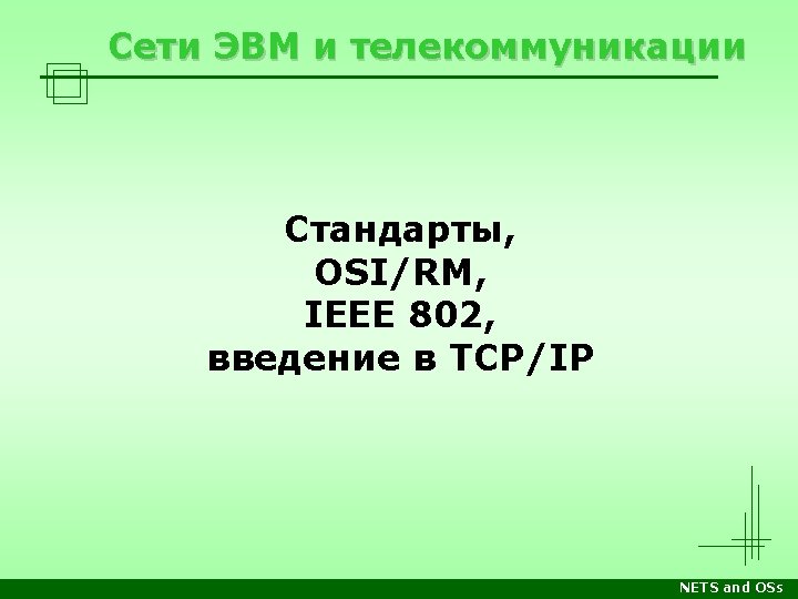 Стеки протоколов Уровень OSI/RM Прикладн. Apple Computer DECnet Microsoft Networking Novell Netware TCP/IP Internet Прикладные программы, напр. почтовый клиент, веб-сервер, сетевые утилиты Представл. Apple. Talk Filling Protocol Network Application Server Message Block Netware Core Protocols Telnet, SMTP, FTP, HTTP… Сеансовый Apple. Talk Session Protocol Session Net. BIOS TCP UDP Транспорт. Apple. Talk Transaction Protocol End Communi -cations Net. BEUI Sequenced Packet Exchange Сетевой Datagram Delivery Protocol Routing Канальный Физическ. Xerox XNS Internet Packet Exchange Control and Process Interaction Sequenced Packet Protocol Internet Protocol (IP) Internet Datagram Protocol Сетевые архитектуры: Ethernet, Token Ring, FDDI, ATM, Local. Talk, др. Лекции Среда передачи: витая пара, оптоволокно, радиоволны… Практика NETS and OSs