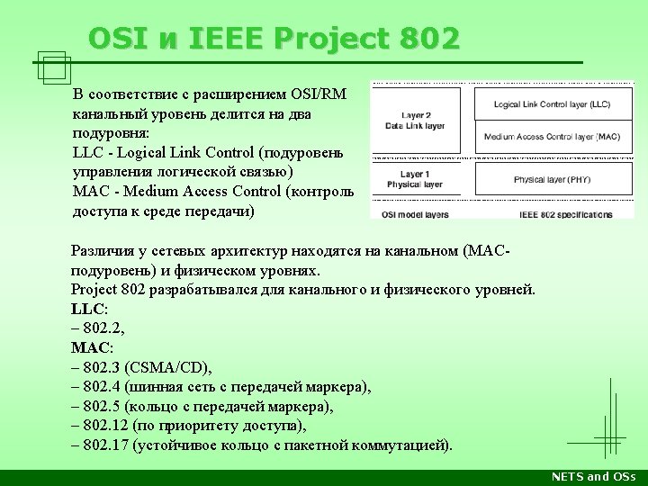 Разработчики стандартов • Institute of Electrical and Electronic Engineers Комитеты, 802 (февраль 1980) (до 802. 17) IEEE 802. 1: Bridging (Networking) and Network Management (VLAN) IEEE 802. 2: Logical Link Control (Upper Part of Data Lnk Layer) IEEE 802. 3: Ethernet (CSMA/CD) IEEE 802. 4: Token Bus (Disbanded) IEEE 802. 5: Defines the MAC Layer for a Token Ring (Inactive) IEEE 802. 6: Metropolitan Area Networks (Disbanded) IEEE 802. 7: Broadband LAN using Coaxial Cable (Disbanded) IEEE 802. 8: Fiber Optic TAG (Disbanded) IEEE 802. 9: Integrated Services LAN (Disbanded) IEEE 802. 10: Interoperable LAN Security (Disbanded) NETS and OSs