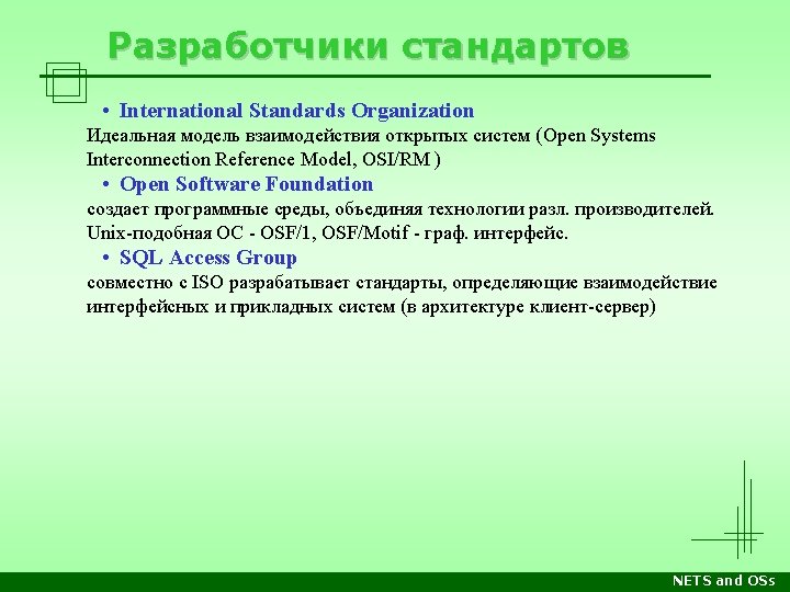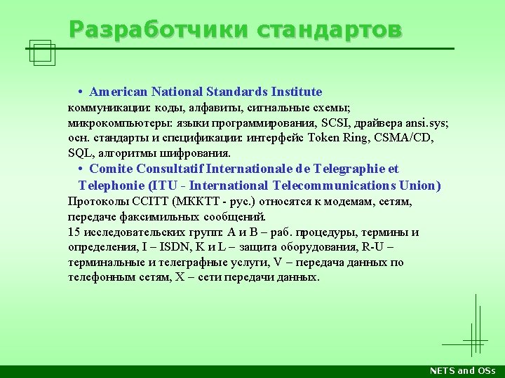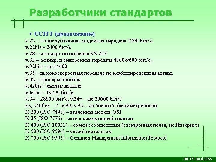 Разработчики стандартов • Institute of Electrical and Electronic Engineers (продолжение) IEEE 802. 11: Wireless LAN & Mesh (Wi-Fi Certification) IEEE 802. 12: Demand Priority (Disbanded) IEEE 802. 13: Not Used IEEE 802. 14: Cable Modems (Disbanded) IEEE 802. 15: Wireless PAN IEEE 802. 15. 1: (Bluetooth Certification) IEEE 802. 15. 4: (Zig. Bee Certification) IEEE 802. 16: Broadband Wireless Access (Wi. MAX Certification) IEEE 802. 16 e: (Mobile) Broadband Wireless Access IEEE 802. 17: Resilient Packet Ring IEEE 802. 18: Radio Regulatory TAG IEEE 802. 19: Coexistence TAG IEEE 802. 20: Mobile Broadband Wireless Access IEEE 802. 21: Media-Independent Handoff IEEE 802. 22: Wireless Regional Area Network IEEE 802. 23: Emergency Services Working Group IEEE 802. 24: Smart Grid TAG New (November, 2012) IEEE 802. 25: Omni-Range Area Network (Not Yet Ratified) NETS and OSs