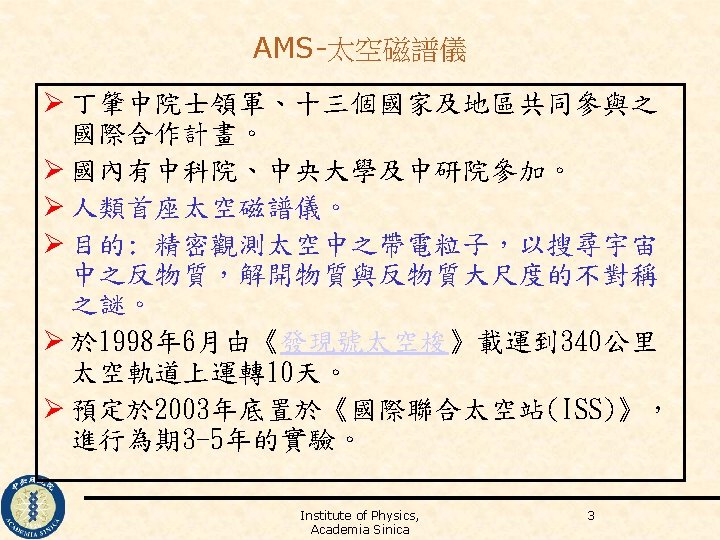 AMS on International Space Station Institute of Physics, Academia Sinica 5