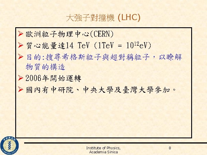 LHC at CERN Institute of Physics, Academia Sinica 9