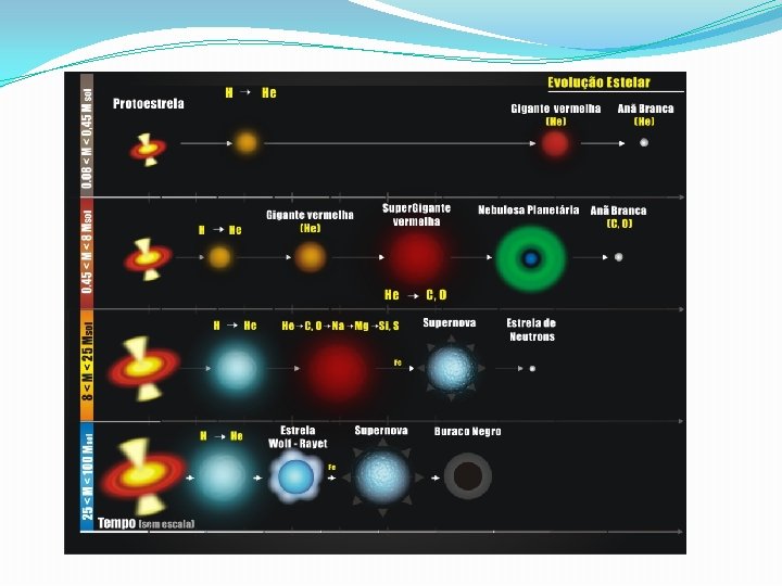 ● Todas as estrelas começam pela fusão do H em He. ● Ao longo de sua vida vão transmutando elementos químicos. ● O tempo de fusão do H em He vai depender da massa da estrela. ● Quanto maior a massa, mais rápida é esta etapa (entre milhões e bilhões de anos).