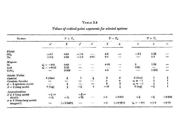 Dados para CO 2 (Andrews, 1869): • densidade média 0. 5 g/cm 3 • a T = 23 °C o fluido está segregado em duas fases coexistentes, separadas por um menisco: § líquida, de densidade liq(T ) § gasosa, de densidade gas(T ) • a T = Tc = 31. 04 °C, L e G ficam idênticas, com densidade liq= gas= c; menisco desaparece no meio de uma opalescência crítica • para qq T > Tc pode-se passar de um estado a outro continuamente T >> Tc ~T T> c T Tc ~T T< c T < Tc T << Tc Tc e c não universais: • Tc depende das escalas de energia das interações (p. ex. , Tc~5 K para 4 He e ~1500 K para Hg); • c depende da escala de comprimentos relevante (p. ex. , separação intermolecular) figuras segundo Stanley (1971)