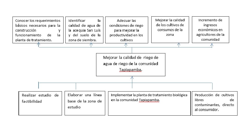 Afectación a la condición de vida de los consumidores Consumo de productos posiblemente contaminados con metales pesados Decrecimiento de ingreso económico en los agricultores Baja productividad en los cultivos Problemas de salud en los consumidores Mala calidad de agua de riego para la comunidad Tapiapamba Desinterés político Abastecimiento de agua contaminada para canal de riego Sin control administrativos de SENAGUA Falta de control de fuentes contaminantes agua MAE Falta de aplicación de leyes para tratar aguas residuales por parte de GADS Bocatoma en el Río Ambí recibe aguas residuales de Antonio Ante, Cotacachi, Urcuquí