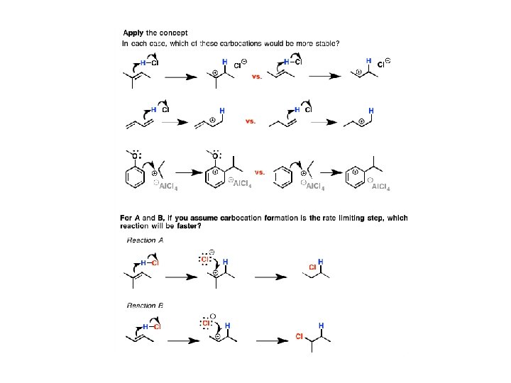Em A ocorre uma adição ao H+ (eletrófilo) formando as duas alternativas de carbocátions O que rege a estabilidade de carbocátions?