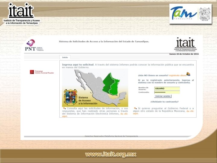 Requerimientos para operar PNT 1 Equipo de cómputo con acceso a Internet 4 Conocimiento básico de Excel 2 Navegador de Internet 5 Lineamientos Técnicos Generales 3 Usuario y Contraseña Sujetos Obligados: Son otorgados por el ITAIT. Unidades Administrativas: creados y distribuidos por la Unidad de Transparencia del su Sujeto Obligado.