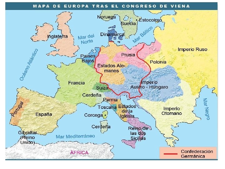 Contexto histórico ü Fueron los procesos de formación de los estados unificados de Italia y Alemania en la segunda mitad del siglo XIX. ü A los principios liberales se suman la noción de soberanía nacional y una visión romántica de la nación. ü Nuevamente, los sectores burgueses son, mayormente, los protagonistas de estos procesos. Giusseppe Garibaldi Otto Von Bismarck