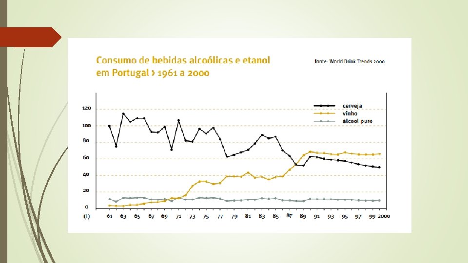 Em Portugal, o consumo “per capita” é dos mais elevados do mundo, tendo-se situado, em 2000, em 10, 8 L de álcool puro, sendo assim o terceiro consumidor mundial.