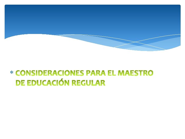 ¿Cuáles son algunas consideraciones para el maestro de educación regular? Muestra interés por el alumno y por su ambiente Ajusta el aula y el ambiente de aprendizaje (CREMA: Currículo, Reglas, Educación, Materiales y Ambiente. ) Hace referencia a las fortalezas y debilidades. Selecciona e implementa adecuaciones e instrucciones para alcanzar las metas de las intervenciones. Utilice procedimientos de enseñanza que resulten efectivos con todos los estudiantes. Evalué el desempeño de los alumnos y la efectividad educativa de manera regular.