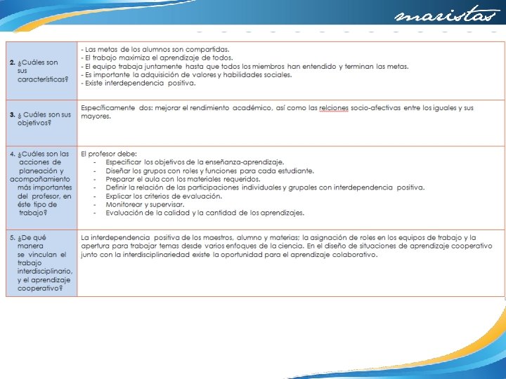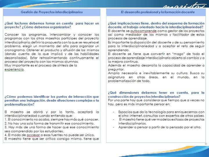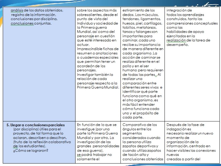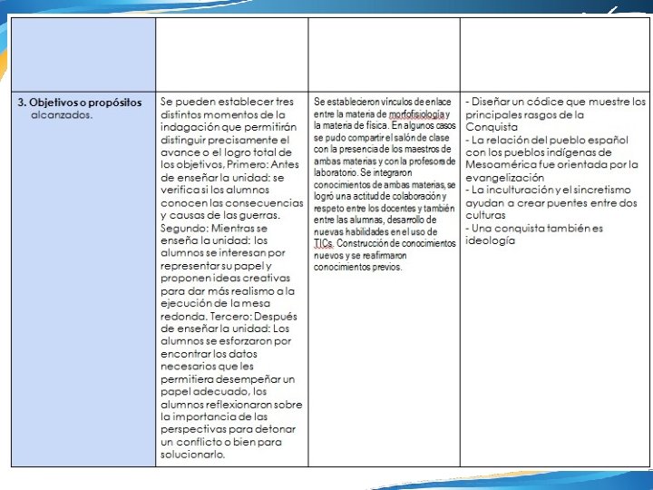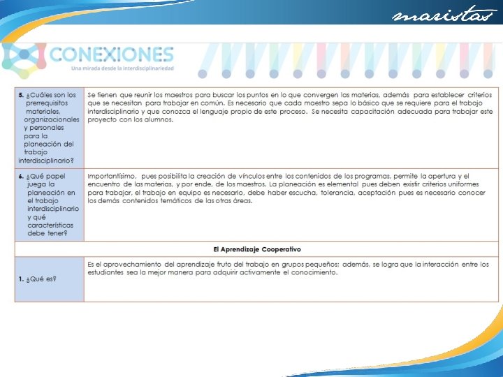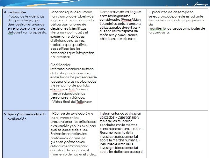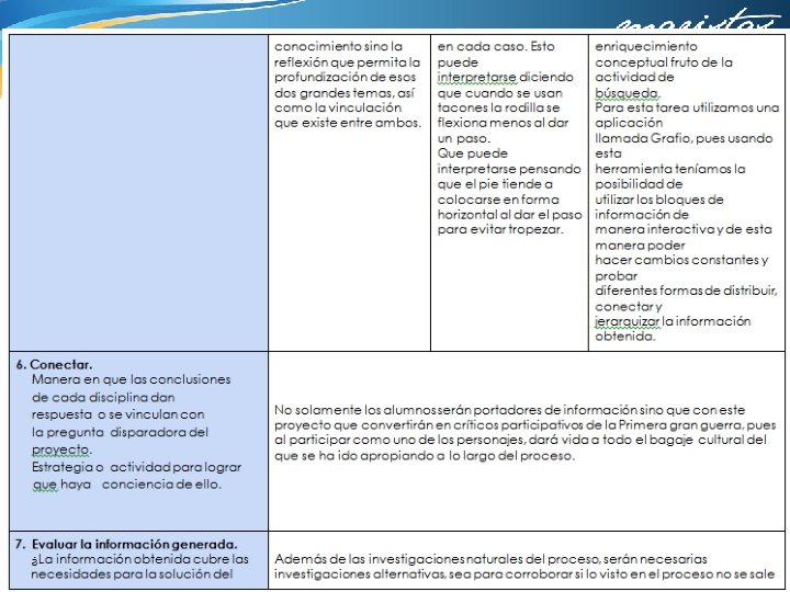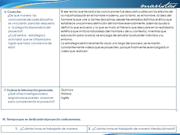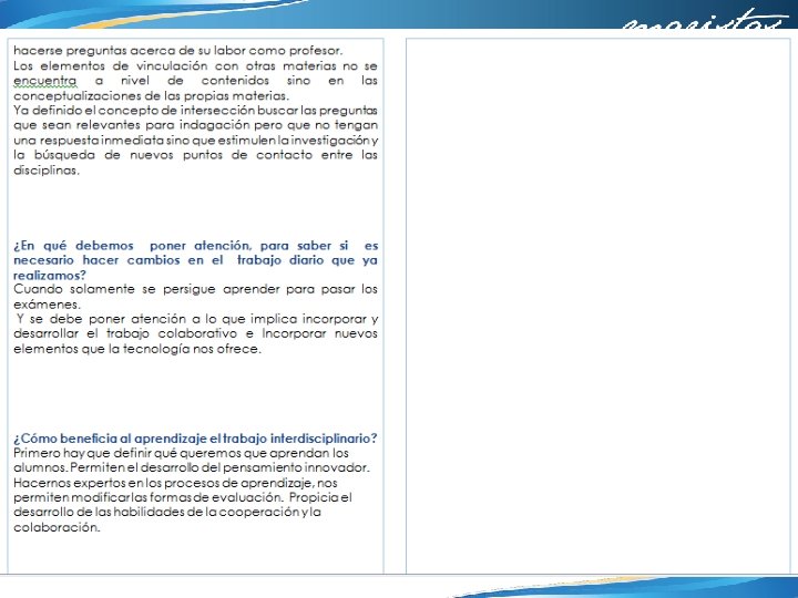 4. ¿Qué aspectos crees que puedes seguir trabajando en ti para obtener mejores resultados? Apropiarme del proyecto asumiendo que es en beneficio de mis alumnos 5. ¿Qué de lo aprendido en el proceso repercute de forma positiva en tus sesiones cotidianas de trabajo? Que el trabajo en equipo requiere de mucho tiempo extra, que los maestros tenemos actividades personales y de trabajo que tenemos que posponer o sacrificar y en ocasiones creemos que los alumnos tienen todo el tiempo para realizar los proyectos de nuestra asignatura. Lo valioso que resulta el trabajar con nuestros compañeros y aprovechar sus experiencias y conocimientos. Hacer consciente la transversalidad e interdisciplinariedad que existe entre las asignaturas 6. ¿De qué manera? Debo pensar más en la carga de trabajo que tienen mis alumnos y dedicar más tiempo de clase a la preparación de tareas y trabajos que lo requieran. Insistir en la repercusión de mi asignatura en todos los aspectos de la vida.