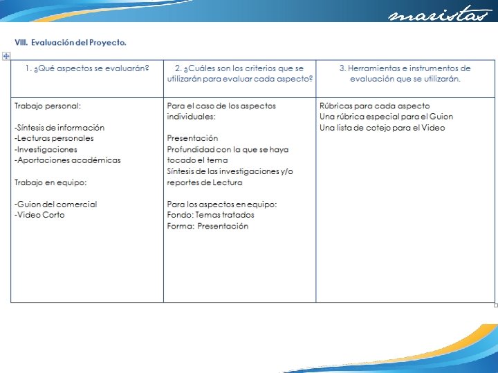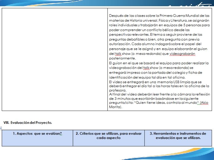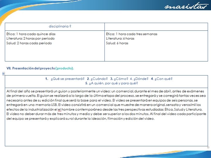 Temas y productos propuestos Al final del año sepresentará un guion y posteriormente un videode tipo comercial de televisión. Durante el mesde abril, antes de exámenes ordinarios de primera vuelta. Elguion serealizará alo largo de la última etapa del proceso, seentregará y secorregirá tantas vecesseanecesario antes de suedición final que será la base para el video. Elvideo sepresentará en equipos de seispersonas, se entregará en una memoria USB. El video consistirá en un comercial que muestre de manera original, sensatay verosímil los efectos dela industrialización en el hombre contemporáneo desde las tres perspectivas estudiadas: ética, Saludy Literatura. Elvideo no debe durar másde tres minutos y medio y debe ser sutiempo superior a los dos minutos. Al final del video cadaparticipantes del equipo se presentará y explicará surol durante la ideación, filmación y edición final delvideo. Falta completar las actividades de evaluación.