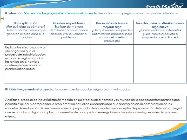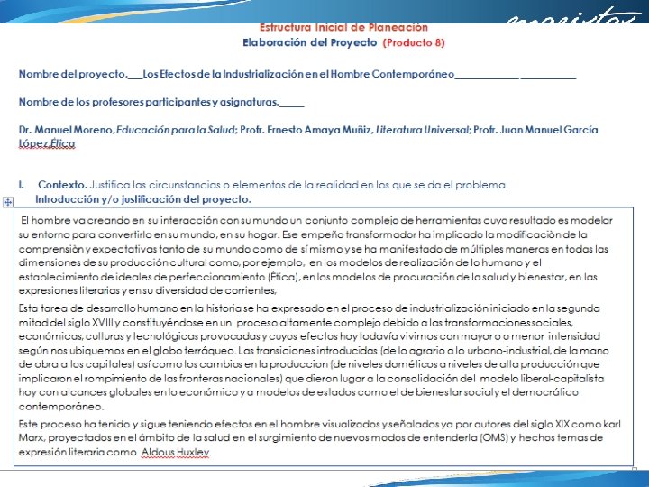 Objetivo General del proyecto Analizar el proceso de industrialización medido en sus efectos en el hombre y su mundo en la época contemporánea que permita explicar y comprender la problemática actual en su complejidad que abarca desde la comprensión de los modelos de realización del ser humano (Ética) que ha propiciado, de los modelos y conceptos de procuración de la salud integral que se ha configurado (Educación para la salud) y los monumentos literarios (Literatura Universal) que han emergido, tematizando las ambigüedades del proceso mismo.