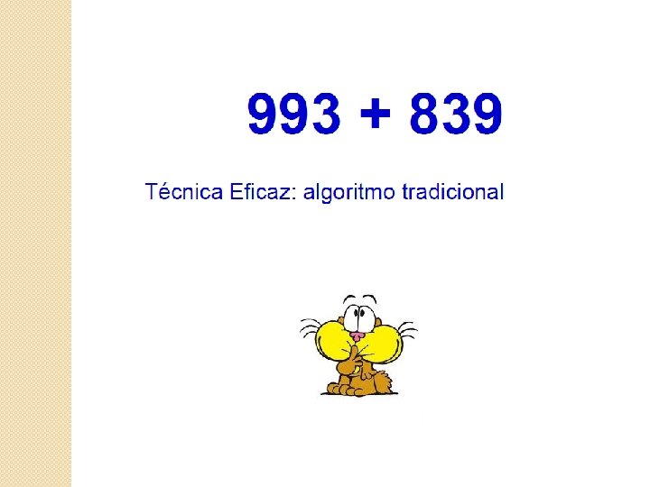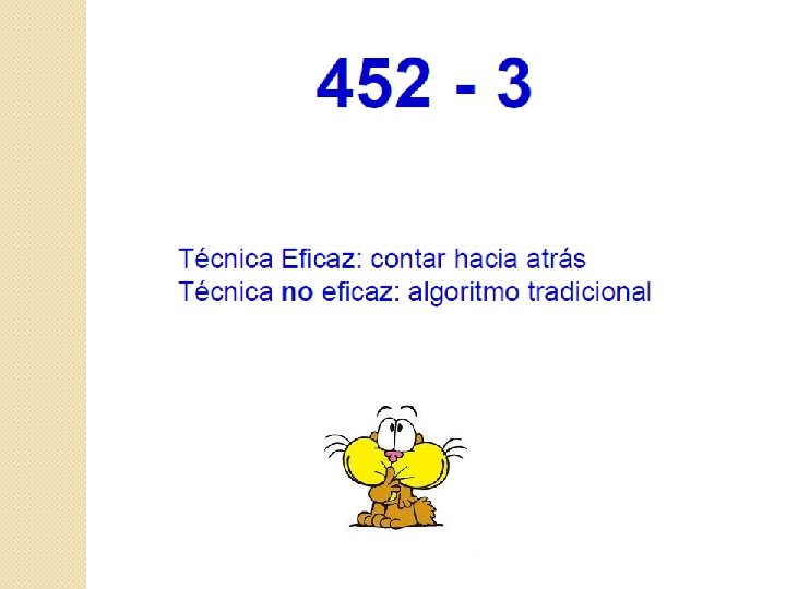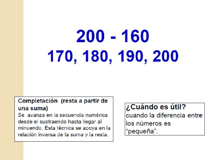 Ideas Centrales 1. - Frente a un determinado cálculo de suma o resta pueden existir distintas técnicas que lo resuelven, pero en muchos casos unas técnicas pueden ser más adecuadas que otras, dependiendo de la relación que exista entre los números. 2. - Es decir, aunque puedan existir distintas técnicas para realizar un mismo cálculo, no siempre son todas igualmente eficientes. Así mismo, unas técnicas que resultaron eficientes para realizar un determinado cálculo, pueden no ser lo frente a otro cálculo, incluso, pueden fracasar.