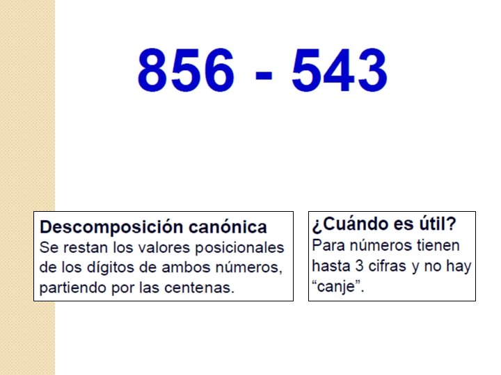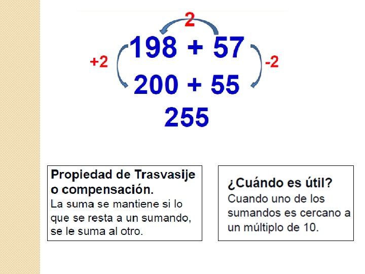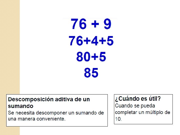 Técnicas de cálculo mental en Capítulo 10 Sumas: 1. Avanzar 10 y retroceder 1 o 2. 2. Avanzar 100 y retroceder 10 o 20. 3. Descomposición canónica (U, D, C) Restas: 1. Retroceder 10 y avanzar 1, 2, 3 o 4. 2. Retroceder 100 y avanzar 10, 20 o 30. 3. Descomposición canónica (U, D, C)
