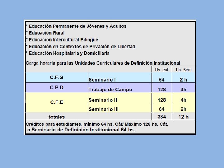 Seminario: se organiza en torno a un objeto de conocimiento que surge de un recorte parcial de un campo de saberes. Este recorte puede asumir carácter disciplinar o multidisciplinar y permite profundizar en aspectos y/o problemáticas consideradas relevantes para la formación. Se sugiere para su desarrollo la organización de propuestas metodológicas que promuevan la indagación, el análisis, la construcción de problemas y formulación de hipótesis o supuestos explicativos, la elaboración razonada y argumentada de posturas teóricas, la exposición y socialización de la producción. Institucionalmente se podrá acordar el desarrollo de aproximaciones investigativas de sistematización y complejidad creciente de primero a cuarto año. Para la acreditación se propone un encuentro “coloquio” con el docente titular que puede asumir diferentes modalidades: la producción escrita de un informe, ensayo o monografía y su defensa oral, la revisión e integración de los contenidos