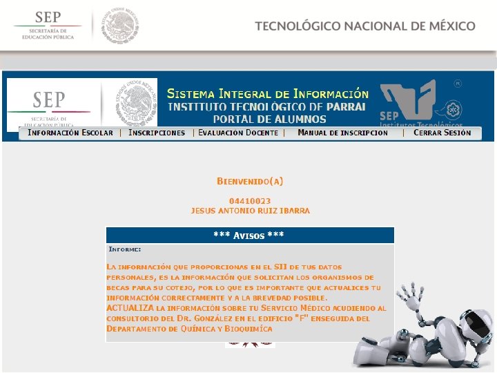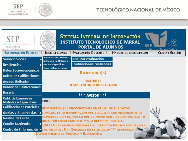 Es muy importante prestar atención a la PANTALLA DE BIENVENIDA, ahí podrás encontrar la siguiente información: Ø Avisos importantes, donde podrás consultar el estado en el que te encuentras como estudiante del Instituto Tecnológico de Parral. Ø Podrás observar los pendientes o adeudos que tengas con las áreas de la institución (Centro de Información, Servicios Escolares, Laboratorio de Informática, etc. )