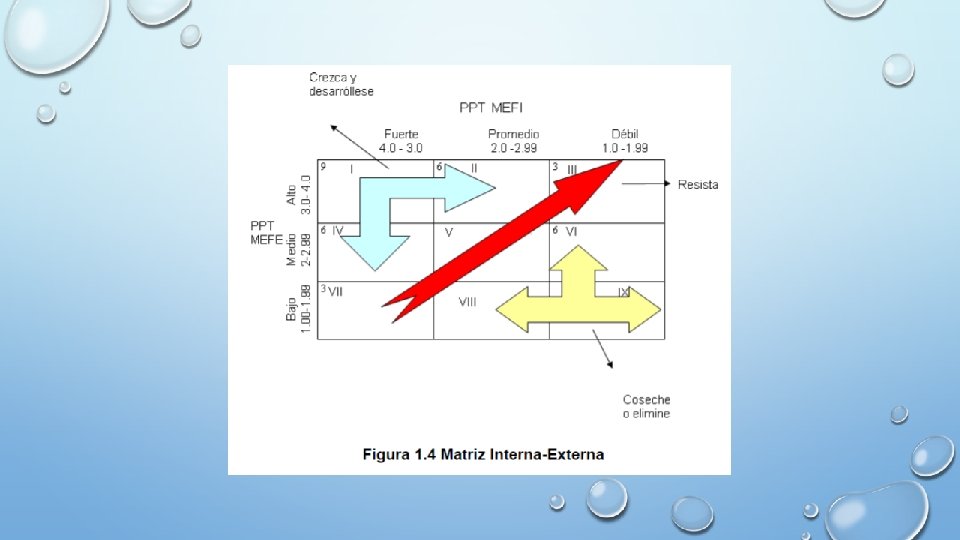 LA MATRIZ INTERNA-EXTERNA LA MATRIZ INTERNA EXTERNA REPRESENTA UNA HERRAMIENTA PARA EVALUAR A UNA ORGANIZACIÓN, TOMANDO EN CUENTA SUS FACTORES INTERNOS (FORTALEZAS Y DEBILIDADES) Y SUS FACTORES EXTERNOS (OPORTUNIDADES Y AMENAZAS), CUANTIFICANDO UN ÍNDICE QUE SE PUEDE GRAFICAR Y UBICAR EN UNO DE LOS 9 CUADRANTES DE DICHA MATRIZ DE FACTOR INTERNO • PARA ELABORAR LA MATRIZ DE FACTOR INTERNO SE DETERMINAN LOS FACTORES INTERNOS DEL ÉXITO. • SE LE DA UNA PONDERACIÓN A CADA FACTOR INTERNO, DE ACUERDO A LA IMPORTANCIA QUE REPRESENTA PARA EL ÉXITO DE LA ORGANIZACIÓN (Y LA SUMA DE LAS PONDERACIONES DEBE SER 1, PARA NORMALIZARLOS). • SE LE DA UNA CALIFICACIÓN A CADA FACTOR INTERNO, DE ACUERDO A CÓMO SE PERCIBE EN LOS MOMENTOS ACTUALES, EN UNA ESCALA DEL 1 AL 4, DONDE 1 ES MALO Y 4 ES BUENO. • SE MULTIPLICA LA PONDERACIÓN POR LA CALIFICACIÓN, PARA OBTENER EL ÍNDICE DE FACTOR INTERNO.