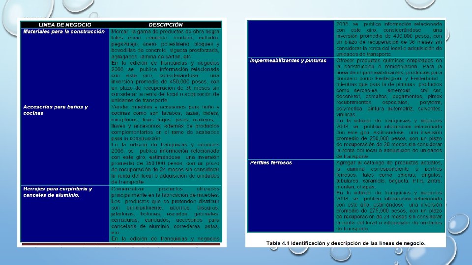 ESTUDIO DE PERFIL DEFINICIÓN Y SELECCIÓN DE LA LÍNEA DE NEGOCIO LAS POSIBLES LÍNEAS DE NEGOCIO PARA LA FIRMA SE DESCRIBEN BREVEMENTE EN LA TABLA 4. 1 ESTA DESCRIPCIÓN SE OBTUVIERON DE UN CATALOGO DE FRANQUICIAS, POR LO QUE SOLO SE RECABO LA INFORMACIÓN REFERENTE A LAS LÍNEAS QUE SE MUESTRAN A CONTINUACIÓN: