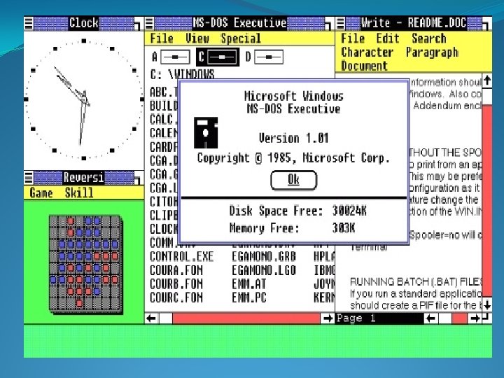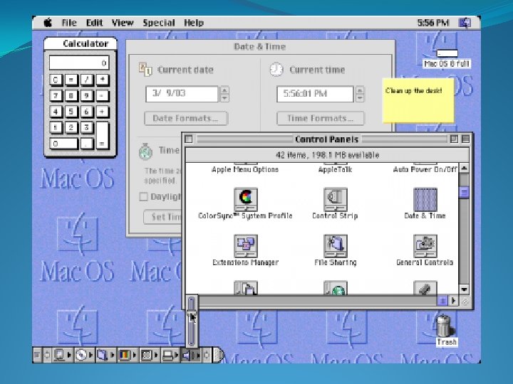 Mac OS: • El lanzamiento oficial del ordenador Macintosh • • en enero de 1984. Precio de US $1, 995 (después cambiado a $2, 495 dólares). Mac OS cuya características novedosas era una GUI. Multitareas y Mouse. Algunos tachando el uso del Mouse como juguete.