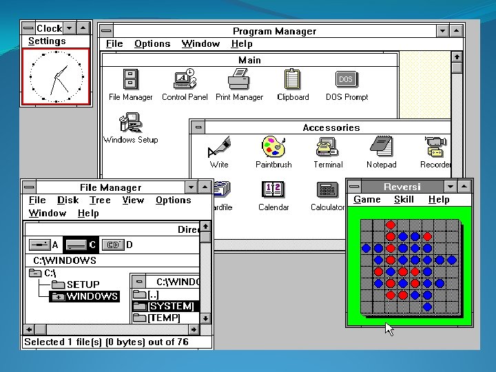 Windows: • A mediados de los años 80 se crea este sistema operativo. • Pero no es hasta la salida de Windows 95 que se le puede considerar un sistema operativo. • Solo era una interfaz gráfica del MS-DOS. • Hoy en día es el sistema operativo más difundido en el ámbito doméstico es: Windows XP.