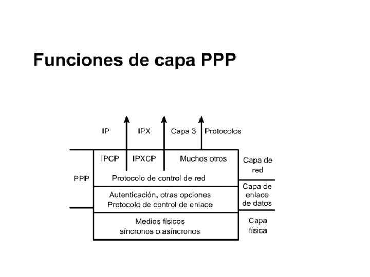 PPP utiliza una arquitectura dividida en capas. Con sus funciones de nivel inferior, PPP puede utilizar: - Medios físicos síncronos, como los que conectan las redes de la Red digital de servicios integrados (RDSI). - Medios físicos asíncronos, como los que utilizan el servicio telefónico básico para las conexiones de acceso telefónico del módem.