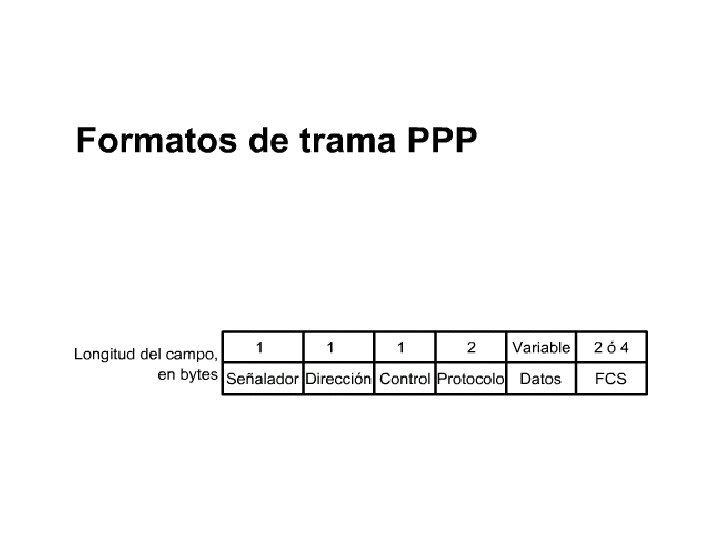 Como se indica en la figura, los campos de una trama PPP son los siguientes: Señalador: Indica el comienzo o el fin de una trama y está formado por la secuencia binaria 01111110. Dirección: Está formada por la dirección de broadcast estándar, que es la secuencia binaria 1111. PPP no asigna direcciones de estaciones individuales. Control: 1 byte formado por la secuencia binaria 00000011, que requiere la transmisión de datos del usuario en una trama no secuencial. Se suministra un servicio de enlace no orientado a conexión similar al del Control de enlace lógico (LLC) de Tipo 1.