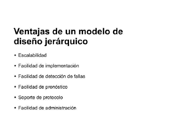 Las ventajas del uso de un modelo jerárquico incluyen las siguientes: 1. Escalabilidad 2. Facilidad de implementación 3. Facilidad para el diagnóstico de fallas 4. Capacidad de predicción 5. Soporte de protocolo 6. Facilidad de administración