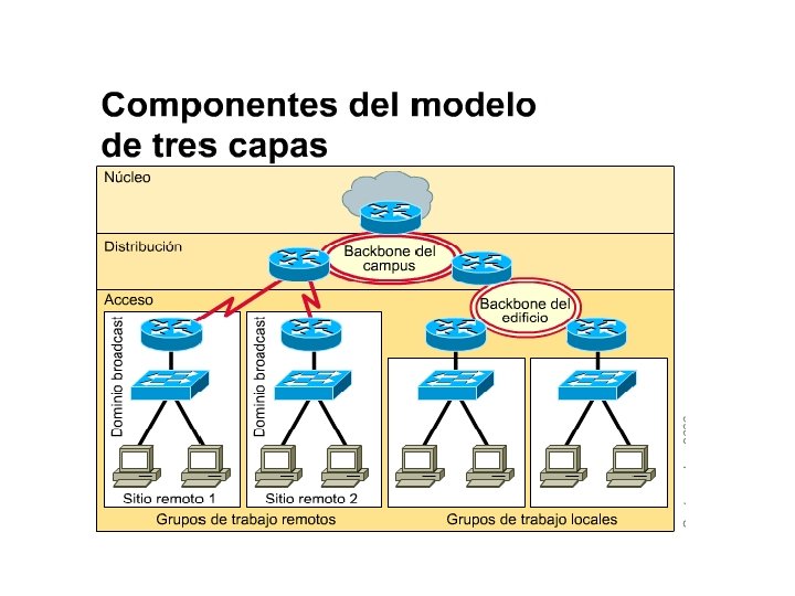 Las tres capas se encuentran conectadas por dispositivos de Capa 3 u otros dispositivos que dividen la red en dominios de broadcast.