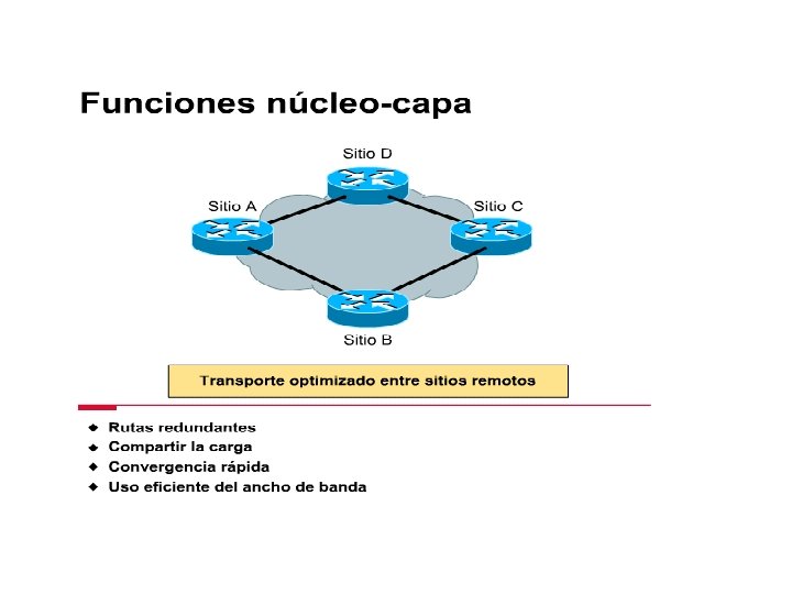 Capa núcleo: La capa núcleo proporciona conexiones rápidas de área amplia entre sitios separados por grandes distancias geográficas, uniendo varias redes de campus en una WAN corporativa o empresarial. Los enlaces núcleo son normalmente punto a punto, y rara vez hay hosts en la capa núcleo. Los servicios de núcleo (por ejemplo, T 1/T 3, Frame Relay, SMDS) normalmente son arrendados a un proveedor de servicios de telecomunicaciones.
