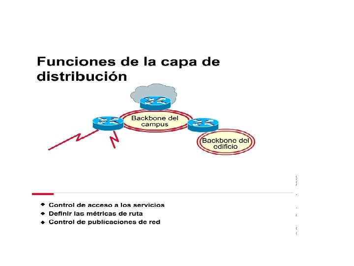 La capa de distribución debe incluir el backbone del campus con todos los routers que lo conectan. Como las políticas normalmente se implementan en este nivel, podemos decir que la capa de distribución proporciona conectividad basada en políticas.