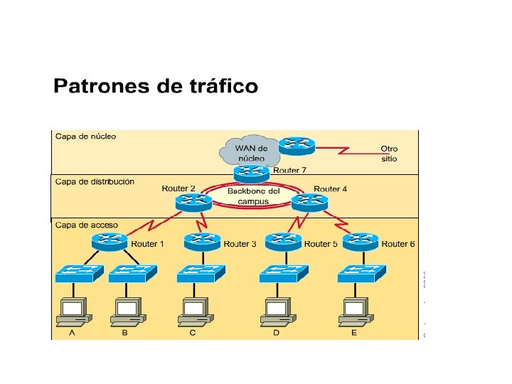 Un diseño de red jerárquico incluye las siguientes tres capas: a) La capa núcleo proporciona transporte óptimo entre sitios. b) La capa de distribución, que brinda conectividad basada en políticas. c) La capa de acceso, que proporciona acceso para los usuarios y grupos de trabajo a la red