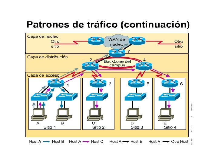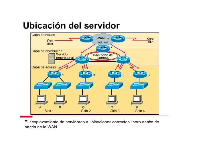 La ubicación de los servidores en relación con quienes accedan a ellos afecta los patrones de tráfico en la WAN. Si se coloca un servidor empresarial en la capa de acceso del Sitio 1, como se ve en la figura todo el tráfico destinado a ese sitio se ve forzado a pasar por los enlaces entre los Routers 1 y 2. Esto consume cantidades importantes de ancho de banda desde el Sitio 1.