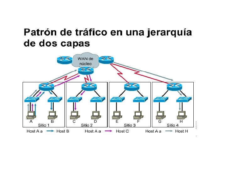 En una jerarquía WAN de dos capas, como la que vemos en la figura , el tráfico sólo recorre la jerarquía hasta el punto en que esto es necesario para llegar a destino, conservando de esta manera el ancho de banda en otros enlaces WAN.