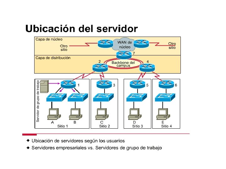 En la figura, se coloca un servidor de grupo de trabajo en la capa de acceso del sitio donde se ubica la mayor concentración de usuarios, y el tráfico que atraviesa el enlace WAN para acceder a este servidor es limitado. De esta manera, hay más ancho de banda disponible para acceder a los recursos de fuera del sitio.