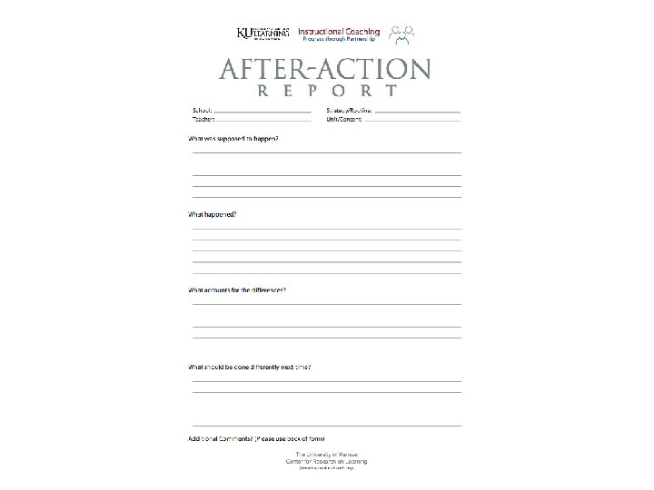 After-action Review l On your own ¡(coaching form, notebook, computer journal, tape or ipod oral history) l With your team l With collaborating teacher www. instructionalcoach. org